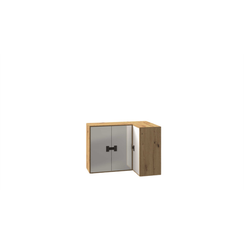 Składa się z części dwudrzwiowej z półkami oraz jednodrzwiowej z półkami, co umożliwia łatwe organizowanie ubrań, zabawek czy innych drobiazgów. Korpus komody wykonany jest z laminowanej płyty meblowej, a fronty dostępne są w połyskujących kolorach: białym, dębowym lub szarym, co nadaje meblowi nowoczesny i stylowy wygląd.