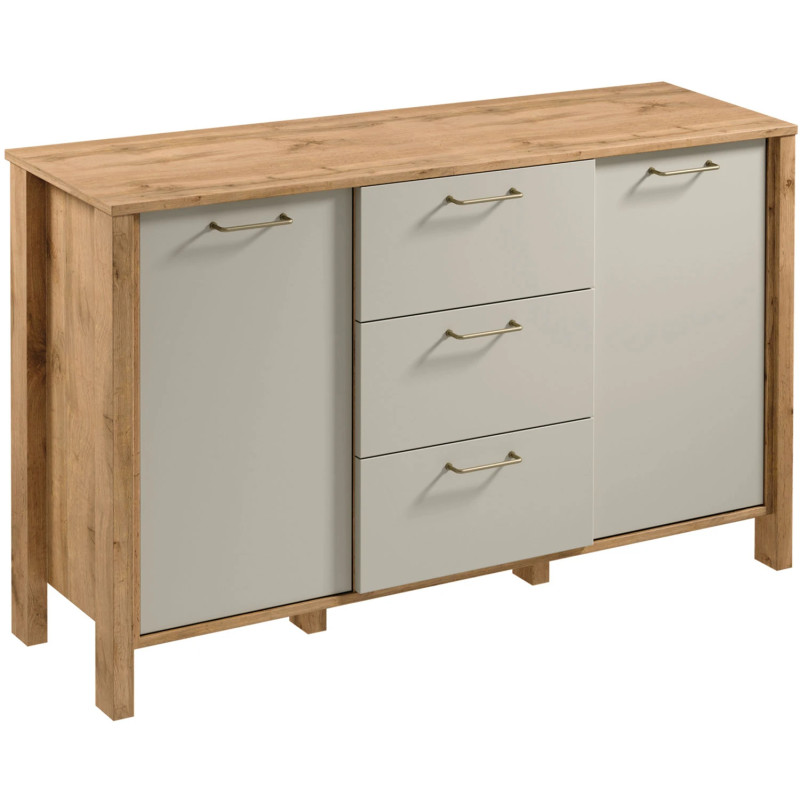 Komoda Indygo K2D3S od Gała Meble to elegancki i funkcjonalny mebel, który doskonale komponuje się w nowoczesnych wnętrzach. Wykonana z wysokiej jakości płyty laminowanej, charakteryzuje się odpornością na uszkodzenia, wilgoć oraz wysoką temperaturę, co zapewnia jej trwałość i estetyczny wygląd przez długi czas. Połączenie naturalnego odcienia Dąb Wotan z modnym beżowym odcieniem frontów nadaje komodzie wyjątkowego charakteru.