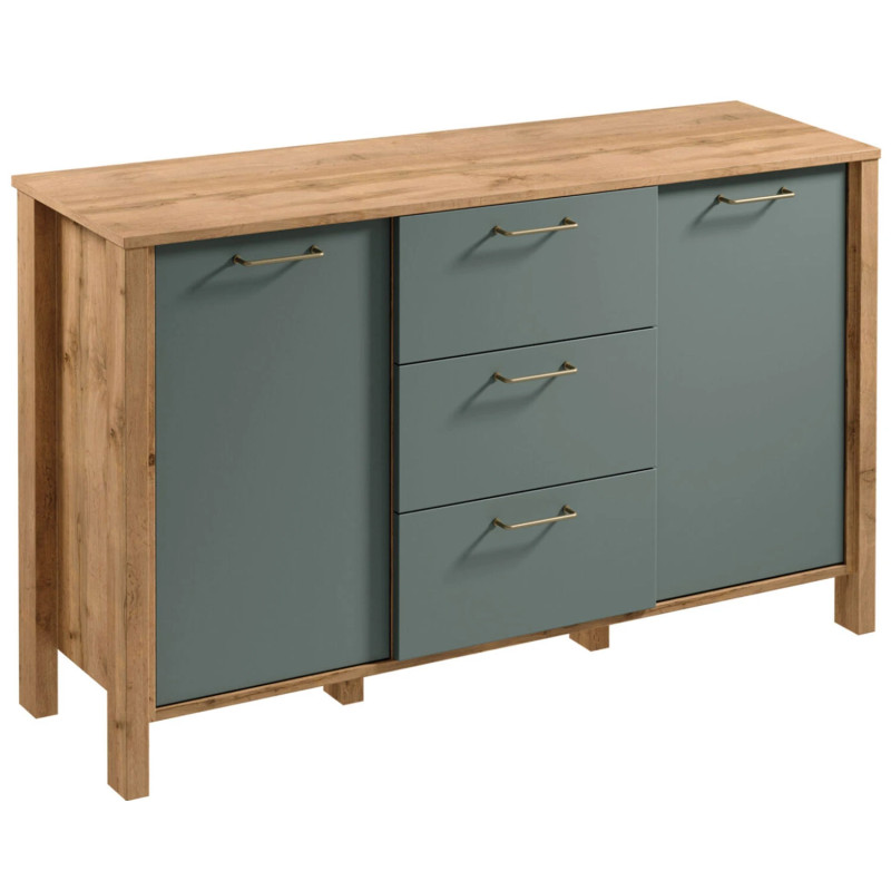 Komoda Indygo K2D3S od Gała Meble to elegancki i funkcjonalny mebel, który doskonale komponuje się w nowoczesnych wnętrzach. Wykonana z wysokiej jakości płyty laminowanej, charakteryzuje się odpornością na uszkodzenia, wilgoć oraz wysoką temperaturę, co zapewnia jej trwałość i estetyczny wygląd przez długi czas. Połączenie naturalnego odcienia Dąb Wotan z modnym zielonym odcieniem frontów nadaje komodzie wyjątkowego charakteru.