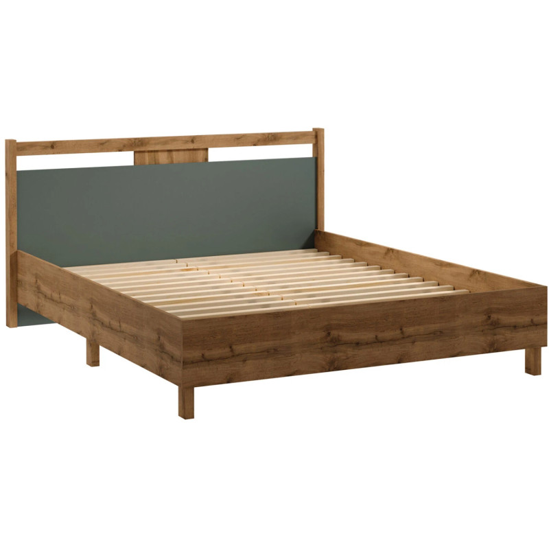 Kolorystyka łącząca naturalny odcień Dąb Wotan z subtelną zielenią frontów nadaje wnętrzu świeżości i elegancji. Łóżko oferuje powierzchnię spania o wymiarach 160x200 cm, co gwarantuje komfortowy wypoczynek dla dwóch osób. Solidna konstrukcja oraz stabilny stelaż zapewniają bezpieczeństwo i wygodę użytkowania.