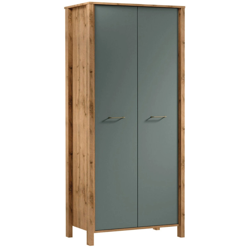Szafa wyposażona jest w drążek do zawieszania ubrań oraz praktyczne półki, co umożliwia wygodną organizację odzieży. Uchwyty w matowo złotym kolorze dodają elegancji i podkreślają nowoczesny design mebla.
