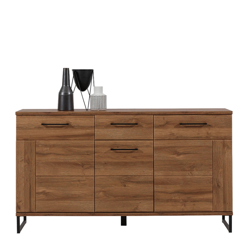 Komoda IVO IV03 to przestronna, trzydrzwiowa komoda, która łączy w sobie maksymalną funkcjonalność z nowoczesnym designem. Świetnie sprawdzi się zarówno w jadalni, salonie, jak i pokoju dziennym, oferując dużą powierzchnię do przechowywania. Dwie pojemne wnęki ukryte za frontami szafek oraz praktyczna szuflada zapewniają komfortową organizację przestrzeni i umożliwiają przechowywanie rozmaitych przedmiotów – od naczyń, przez tekstylia, po dokumenty. Geometryczny wzór na froncie, elegancka faktura drewna oraz czarne uchwyty i smukłe nogi tworzą stylowy akcent, który odnajdzie się w industrialnych i nowoczesnych aranżacjach. Komoda IV03 może funkcjonować jako samodzielny mebel lub element większej kompozycji z kolekcji IVO.