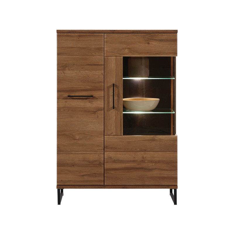 Kredens IVO IV05 to nowoczesna i pojemna propozycja meblowa, która ujmuje funkcjonalną prostotą oraz doskonale dopełnia wystrój salonu i jadalni. Mebel wyposażono w dwie praktyczne szafki oraz przeszkloną witrynę, tworząc przestrzeń zarówno do przechowywania, jak i ekspozycji dekoracji. Witryna z przeszklonym frontem i szklaną półką pozwala pięknie wyeksponować ozdoby, a wbudowane oświetlenie LED podkreśla klimat wnętrza i dodaje elegancji. Geometryczny wzór frontów, czarne uchwyty oraz faktura drewna w kolorze dąb artisan nadają kredensowi industrialnego charakteru. Czarne, smukłe nogi podkreślają lekkość bryły i ułatwiają utrzymanie porządku pod meblem.