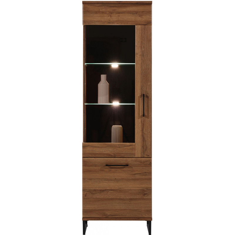 Witryna lewa IVO IV06 to elegancki i funkcjonalny mebel, który doskonale sprawdzi się nawet w niewielkiej jadalni lub pokoju dziennym. Jej kompaktowa forma skrywa trzy wnęki za szklanymi drzwiczkami, idealne do wyeksponowania kieliszków, porcelany czy dekoracyjnych dodatków. Dwie dodatkowe wnęki za pełnymi frontami zapewniają miejsce na mniej reprezentacyjne przedmioty. Standardowe podświetlenie LED subtelnie oświetla zawartość witryny, tworząc przytulny i stylowy klimat we wnętrzu. Geometryczny wzór na frontach, czarne uchwyty i wyrazista faktura drewna w kolorze dąb artisan podkreślają nowoczesny charakter mebla. Całość została osadzona na czarnych, smukłych nogach, które nadają bryle lekkości i elegancji. To idealna propozycja jako pojedynczy akcent lub element kolekcji IVO.