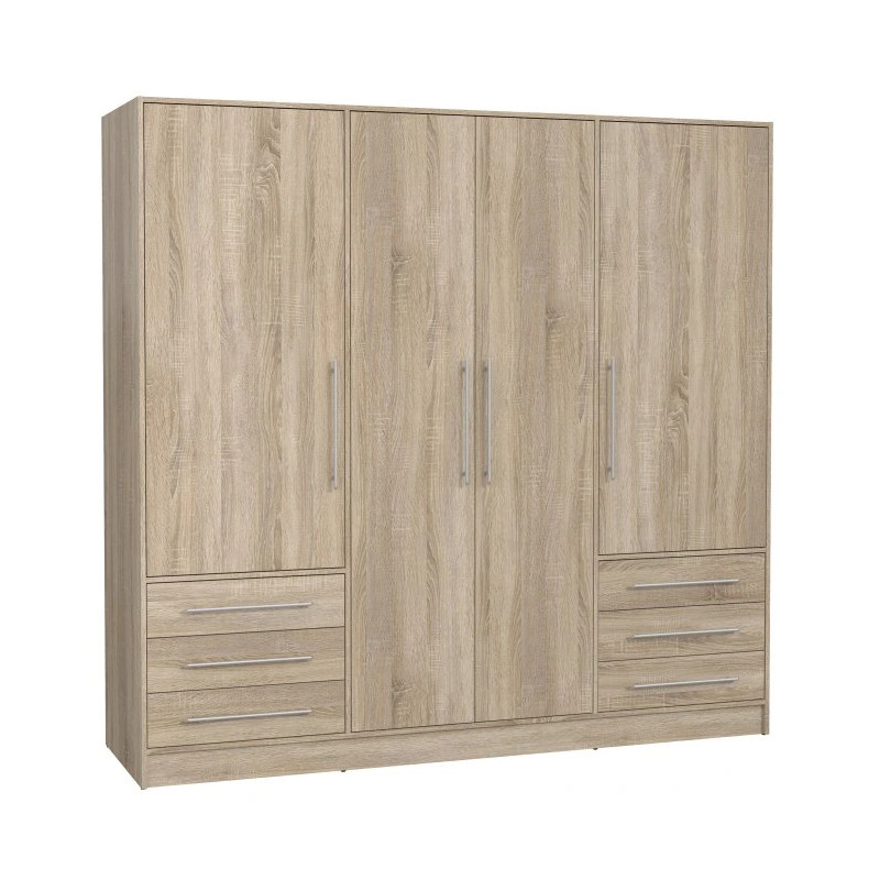 Pojemna szafa ubraniowa 210 cm w dekorze Dąb Sonoma to doskonały wybór do sypialni, garderoby lub przedpokoju. Jej czterodrzwiowa konstrukcja pozwala wygodnie zorganizować przechowywanie zarówno odzieży wiszącej, jak i składanej. Naturalny wygląd dębu z realistycznym usłojeniem wprowadza do wnętrza ciepło, elegancję i przytulny klimat.