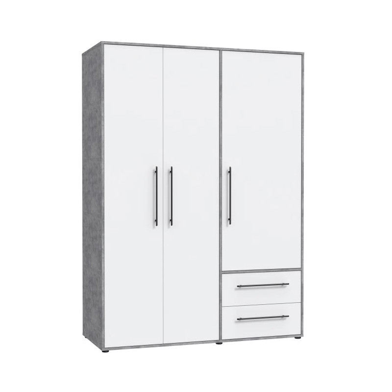 Szafa trzydrzwiowa 145 cm to nowoczesny mebel, który idealnie sprawdzi się w sypialni lub przedpokoju. Połączenie dekoru Beton Jasnoszary i bieli nadaje meblowi elegancki, minimalistyczny charakter, który z łatwością wpasuje się w aranżacje w stylu nowoczesnym i industrialnym.