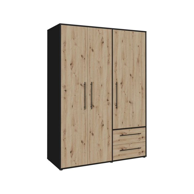 Trzydrzwiowa szafa JUPITER 145 cm w efektownym połączeniu dekorów Czarny i Dąb Artisan to idealny wybór dla osób ceniących nowoczesne, wyraziste wzornictwo połączone z wysoką funkcjonalnością. Jej kompaktowe wymiary sprawiają, że doskonale odnajdzie się zarówno w mniejszych sypialniach, jak i w przedpokojach lub pokojach młodzieżowych.