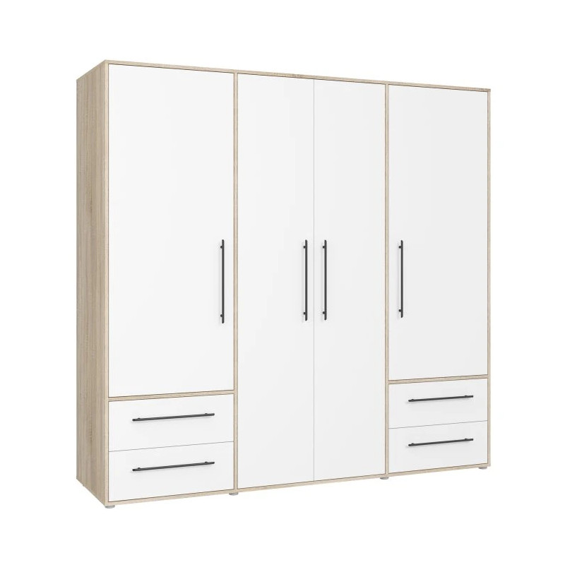 Czterodrzwiowa szafa to elegancki i funkcjonalny mebel, który wyróżni Twoją sypialnię zarówno wizualnie, jak i użytkowo. Połączenie białych frontów z korpusem w dekorze Dąb Sonoma tworzy klasyczną, jasną kompozycję, która rozjaśnia wnętrze i nadaje mu naturalnego ciepła.