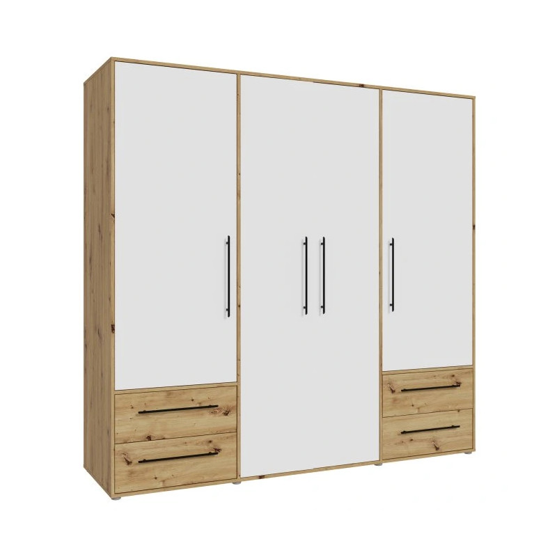 Czterodrzwiowa szafa uchylna JUPITER to idealny wybór do wnętrz urządzonych w stylu skandynawskim. Subtelne połączenie dekorów Dąb Artisan i biel wprowadza do pomieszczenia ciepło oraz optyczną lekkość, doskonale komponując się z jasnymi, naturalnymi aranżacjami.
