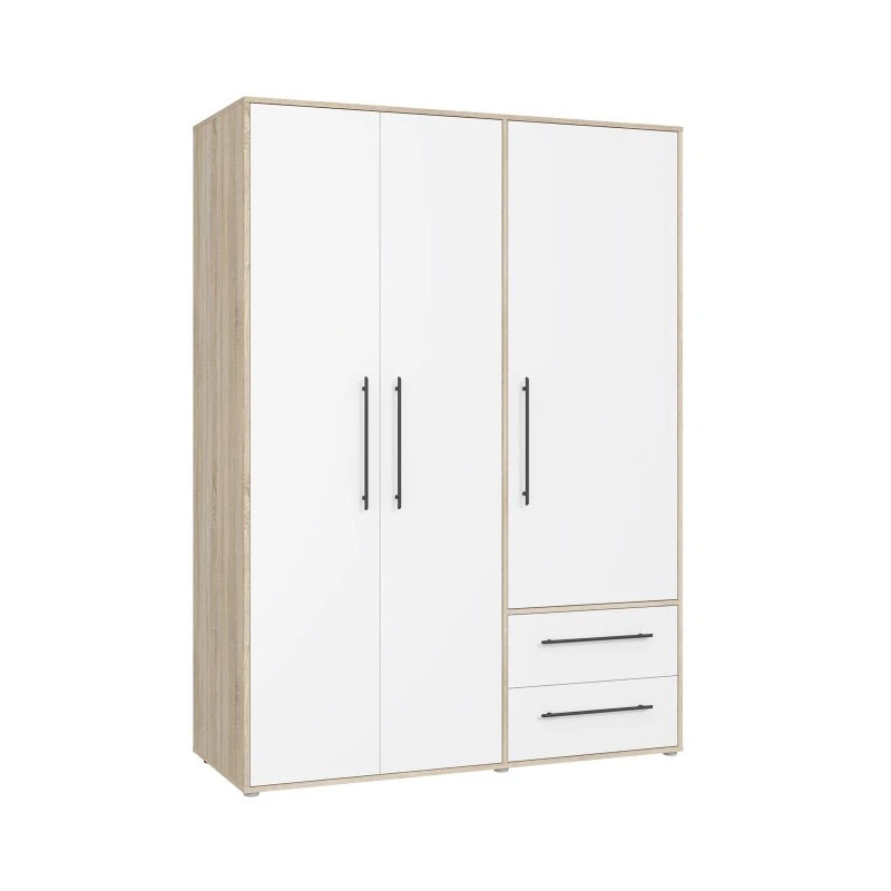 Trzydrzwiowa szafa Jupiter 145 cm to połączenie nowoczesnej funkcjonalności z ponadczasowym stylem. Zestawienie dekorów Biały i Dąb Sonoma wprowadza elegancję i naturalny charakter do wnętrza, dzięki czemu szafa świetnie sprawdzi się w sypialni, garderobie czy przedpokoju.