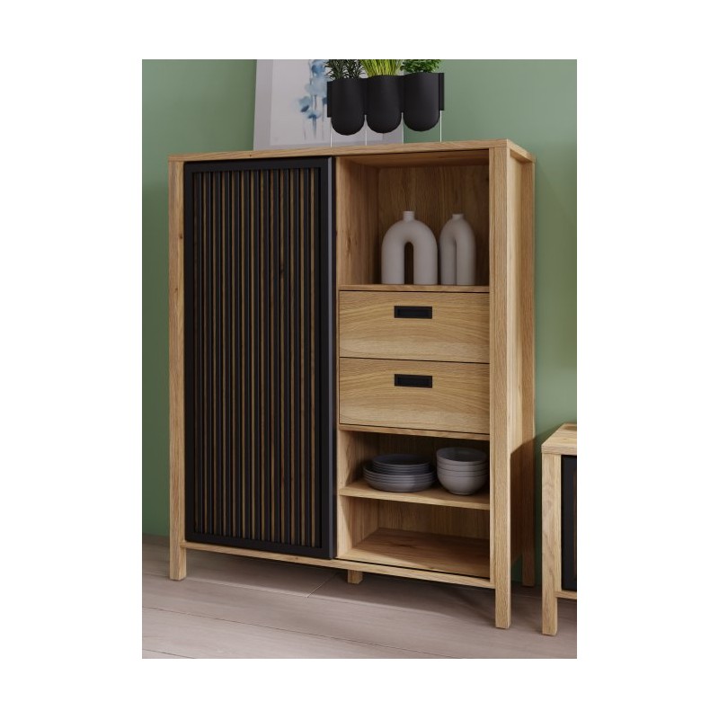 Mebel wykonany jest z wysokiej jakości materiałów, co gwarantuje trwałość i solidność użytkowania. Dąb Mauvella, użyty zarówno na nogach komody, jak i korpusie nadaje jej naturalny, lekko surowy charakter. Czarne uchwyty oraz czarne ozdobne lamelki kontrastują z jasnym drewnem, dodając meblowi wyrazistego wyglądu.