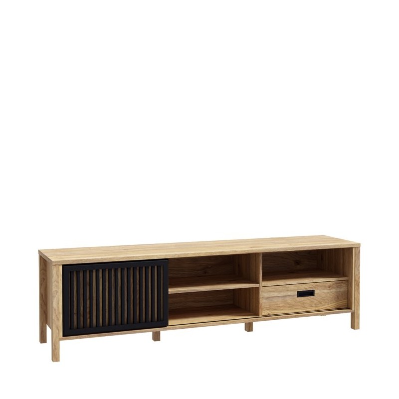 Dopełnieniem całej kompozycji jest styl nowoczesny/loftowy, który nadaje meblowi charakteru i niepowtarzalnego uroku. Kolorystyka w odcieniach czerni i jasnego dębu sprawia, że szafka RTV doskonale komponuje się z różnorodnymi aranżacjami wnętrz, dodając im wyjątkowego charakteru.