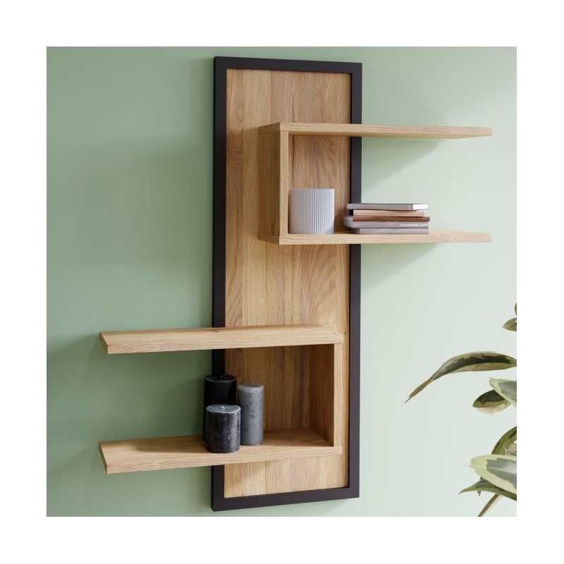 Półka zachwyca swoim wykończeniem dąb mauvella, które harmonizuje z czarnymi elementami, nadając pomieszczeniu niepowtarzalny charakter. Kontrastowe połączenie kolorów nadaje meblowi wyjątkowego uroku, będąc jednocześnie doskonałym wyrazem industrialnego stylu.