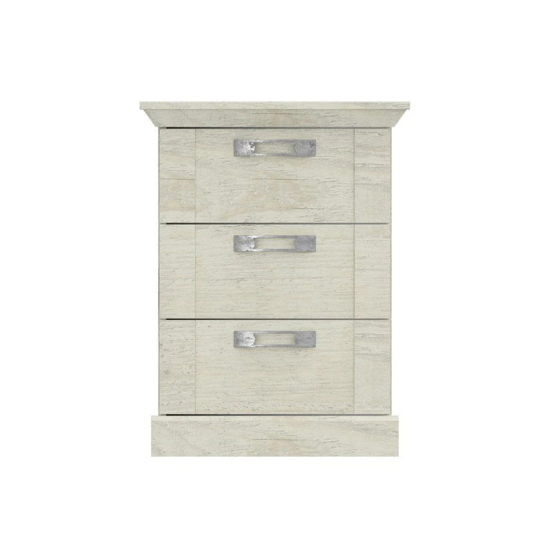 Szafka nocna KASHMIR Pinia Biała to uroczy dodatek do sypialni urządzonej w stylu prowansalskim. Jej subtelna kolorystyka i klasyczna forma wprowadzają do wnętrza romantyczny klimat, a dekor Pinia Biała optycznie rozjaśnia przestrzeń. Ozdobne wieńce górny i dolny nadają meblowi lekkości i elegancji, jednocześnie zachowując jego funkcjonalność. Blat szafki świetnie sprawdzi się jako miejsce na lampkę nocną czy książkę, a trzy pojemne szuflady ułatwiają przechowywanie drobnych przedmiotów, które warto mieć pod ręką.
