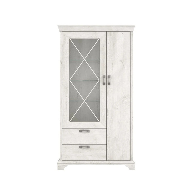 Witryna 110 cm KASHMIR Pinia Biała to elegancki i stylizowany mebel, który doskonale dopełni romantyczną jadalnię lub klasyczny salon. Jej smukła forma i finezyjne detale – ramkowe fronty, krzyżowe szprosy, dekoracyjny wieniec górny i masywny cokół – nawiązują do estetyki dawnych epok. Przeszklona część mebla z hartowanym szkłem transparentnym umożliwia wyeksponowanie zastawy, szkła lub dekoracji, a zamknięta przestrzeń z pięcioma półkami i dwiema szufladami zapewnia miejsce na przedmioty codziennego użytku. Opcjonalne oświetlenie półek dodatkowo podkreśla wyjątkowy charakter mebla.