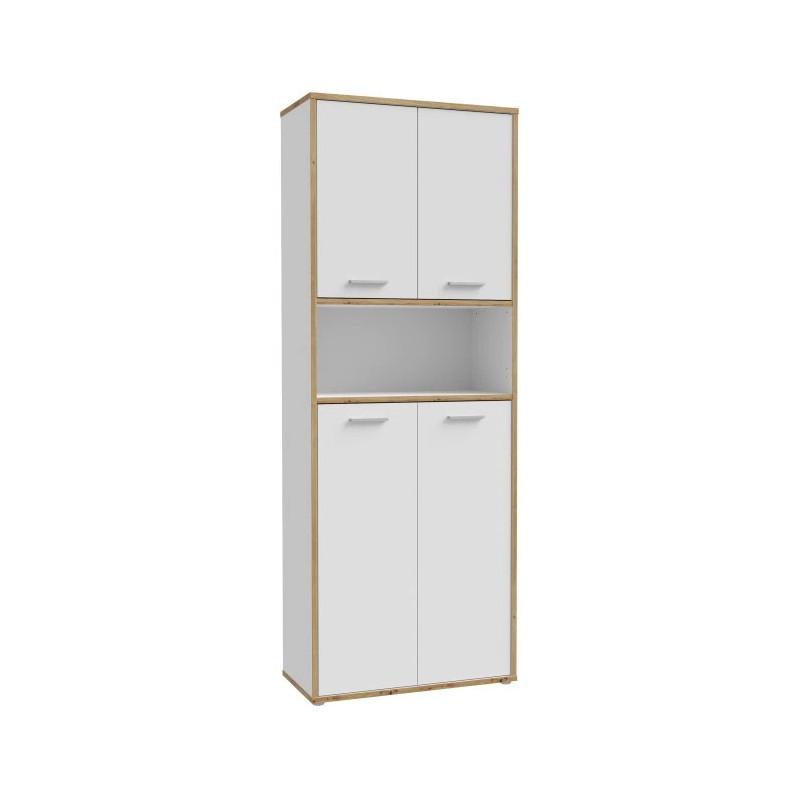 Centralna, otwarta część doskonale sprawdzi się jako miejsce na książki, rośliny i dekoracje. Dwie zamykane szafki po bokach z łatwością pomieszczą teczki, segregatory i inne biurowe akcesoria. Estetyczne połączenie dekoru Biały z ciepłym odcieniem Dąb Artisan wprowadza do wnętrza przytulność i harmonię. Regał idealnie komponuje się z innymi meblami z kolekcji KEFLAVIK, tworząc spójne i funkcjonalne biuro.