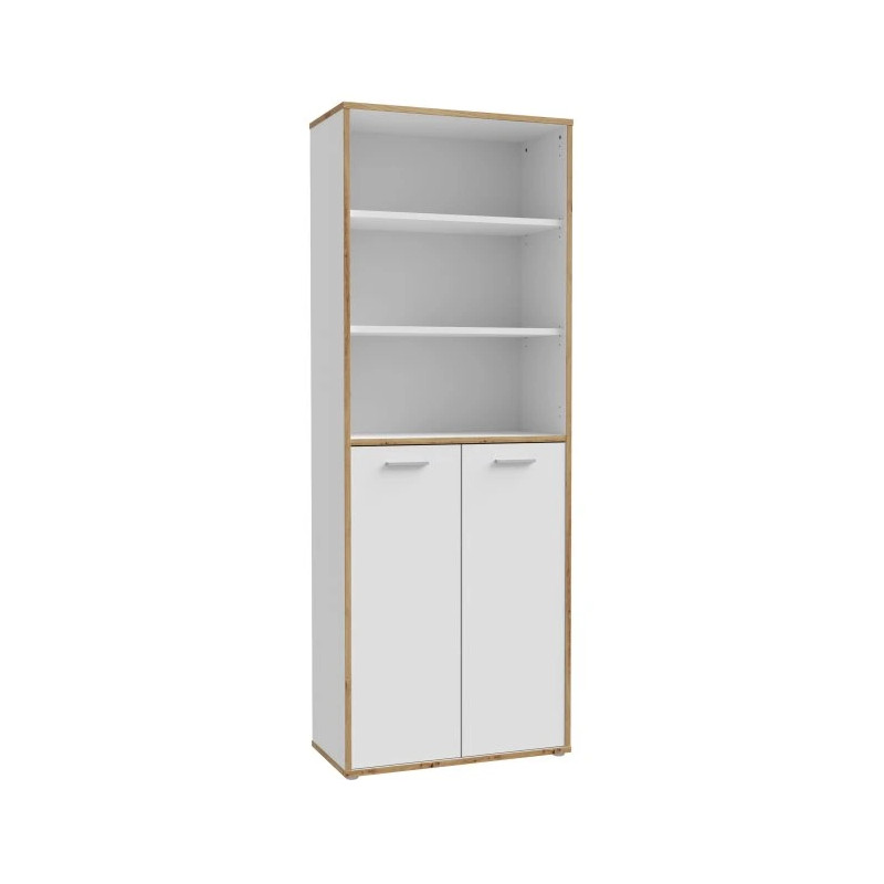 Regał wyposażono w dwudrzwiową szafkę, która doskonale sprawdzi się do przechowywania dokumentów, sprzętu biurowego lub zapasów papieru. Powyżej znajdują się trzy otwarte przestrzenie, idealne do ekspozycji książek, segregatorów, dekoracji czy roślin. Harmonijne połączenie dekorów Biały i Dąb Artisan dodaje wnętrzu naturalnej elegancji. Mebel jest częścią kolekcji KEFLAVIK, dzięki czemu z łatwością stworzysz spójną i komfortową przestrzeń do pracy.