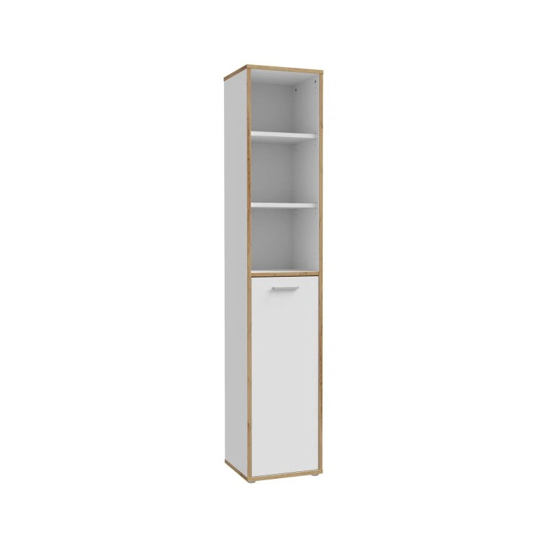 Wąski regał słupek KEFLAVIK w kolorze Biały/Dąb Artisan to funkcjonalny mebel o zgrabnej formie, idealny do biura, gabinetu, salonu lub pokoju młodzieżowego. Dzięki niewielkiej szerokości 45 cm nie zajmuje dużo miejsca, a oferuje aż cztery pojemne półki i trzy otwarte wnęki do przechowywania dokumentów, książek, dekoracji czy przyborów biurowych. Naturalne wykończenie w dekorze Dąb Artisan w połączeniu z białym korpusem nadaje meblowi ciepły, przyjazny charakter, doskonale wpisujący się w styl skandynawski i nowoczesny. Obrzeża ABS zapewniają trwałość, a całość wykonana jest z łatwej w pielęgnacji płyty wiórowej.