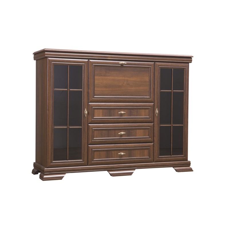 Komoda wyposażona jest w dwudrzwiową szafkę z przeszklonymi frontami oraz trzema pojemnymi szufladami, oferując przestronne miejsce do przechowywania. Metalowe uchwyty w kolorze złota dodają jej elegancji i podkreślają klasyczny charakter.