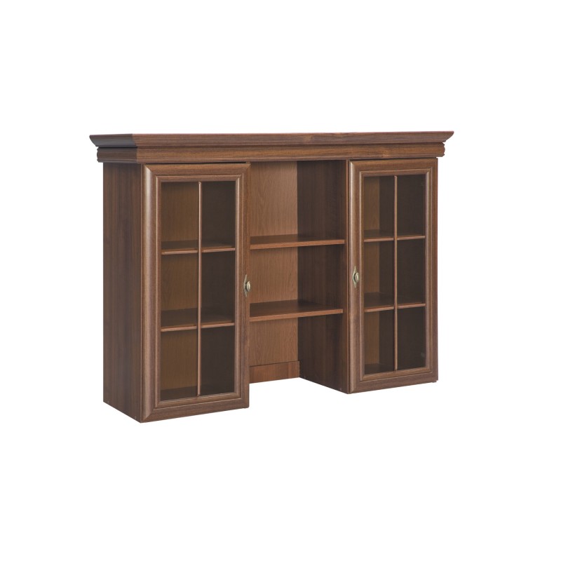 Nadstawka wyposażona jest w dwie przeszklone szafki z półkami oraz dwie otwarte półki między nimi, oferując dodatkową przestrzeń do eksponowania dekoracji lub przechowywania. Metalowe uchwyty w kolorze złota dodają jej elegancji i podkreślają klasyczny charakter.