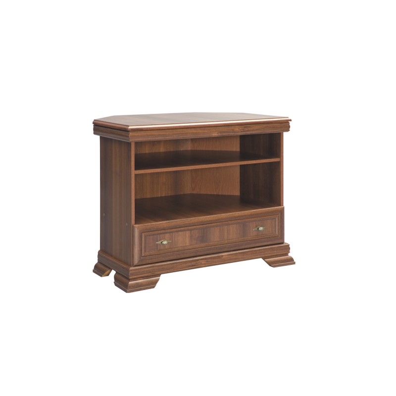 Stolik został zaprojektowany z myślą o praktycznym przechowywaniu sprzętu RTV i akcesoriów. Wyposażony jest w jedną pojemną szufladę oraz otwartą półkę, co pozwala na uporządkowanie urządzeń multimedialnych i ich akcesoriów. Stylizowane nóżki o wysokości 5 cm oraz metalowe uchwyty w kolorze złota dodają mu szyku i podkreślają klasyczny charakter mebla.