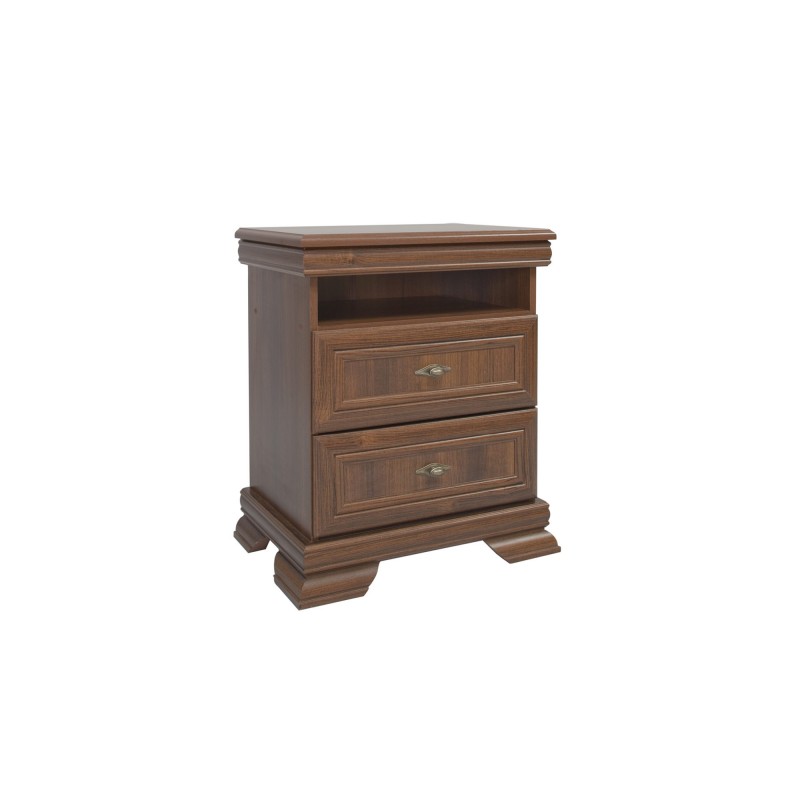 Stolik wyposażony jest w dwie pojemne szuflady oraz otwartą wnękę, co pozwala na wygodne przechowywanie niezbędnych przedmiotów w zasięgu ręki. Metalowe uchwyty w kolorze złota oraz stylizowane nóżki o wysokości 5 cm dodają mu szyku i podkreślają klasyczny charakter mebla.