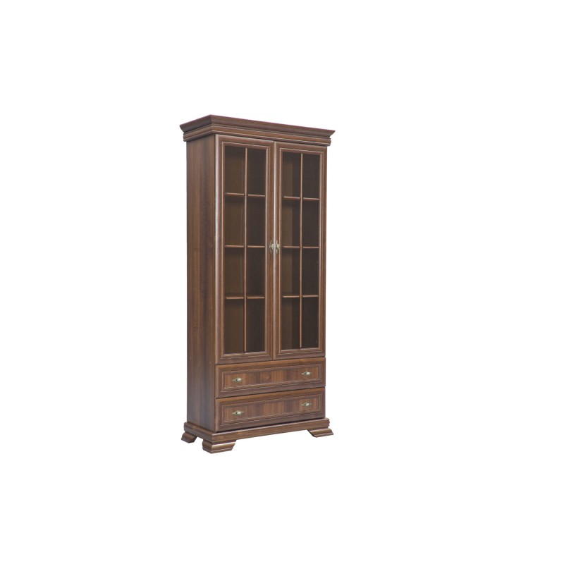 Witryna wyposażona jest w dwudrzwiową przeszkloną część, za którą znajdują się cztery półki, idealne do eksponowania dekoracji, książek czy zastawy stołowej. Dodatkowo, poniżej umieszczono dwie pojemne szuflady, oferujące dodatkową przestrzeń do przechowywania. Stylizowane nóżki o wysokości 5 cm oraz metalowe uchwyty w kolorze złota dodają meblowi szyku i podkreślają jego klasyczny charakter.