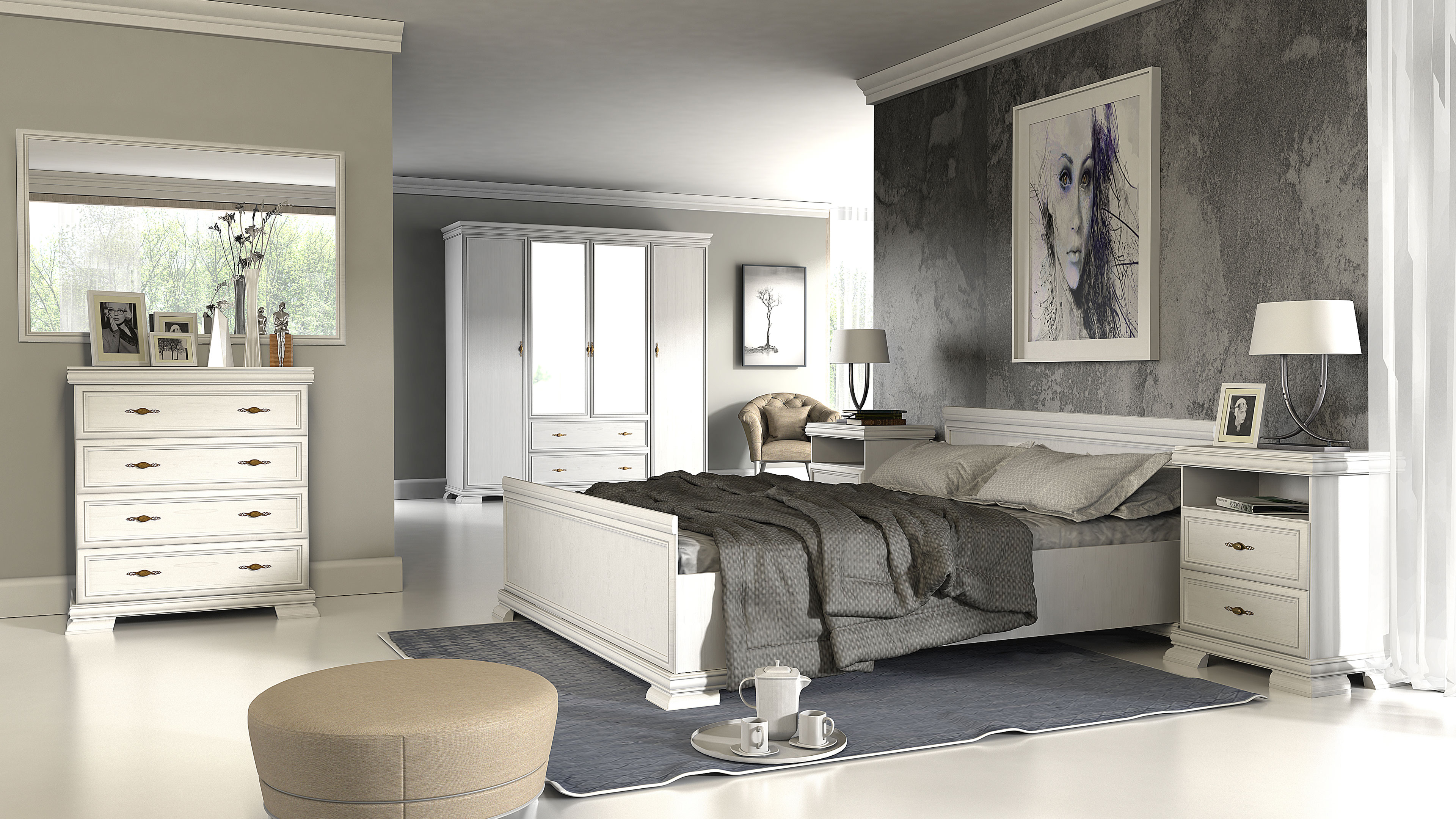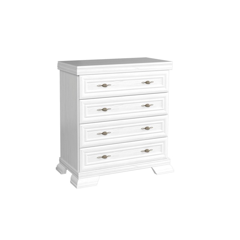 Komoda wyposażona jest w cztery pojemne szuflady, które zapewniają praktyczne miejsce do przechowywania różnych przedmiotów. Metalowe uchwyty w kolorze złota dodają jej elegancji i podkreślają klasyczny charakter.