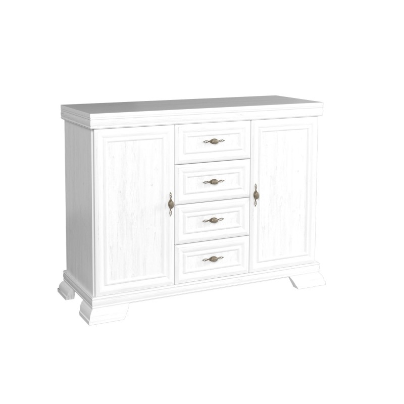 Komoda wyposażona jest w dwie szafki z półkami oraz cztery centralnie umieszczone szuflady, oferując przestronne miejsce do przechowywania. Metalowe uchwyty w kolorze złota dodają jej elegancji i podkreślają klasyczny charakter.