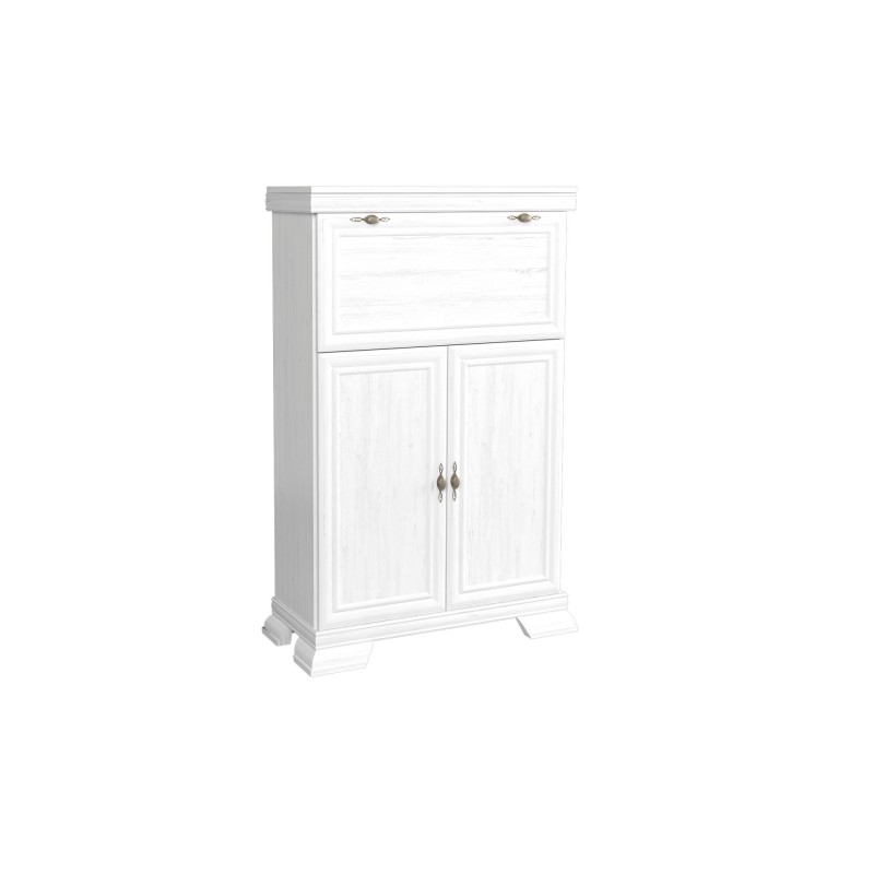Komoda wyposażona jest w dwudrzwiową szafkę z półką oraz barek z uchylnymi drzwiami, oferując praktyczne miejsce do przechowywania. Metalowe uchwyty w kolorze złota dodają jej elegancji i podkreślają klasyczny charakter.