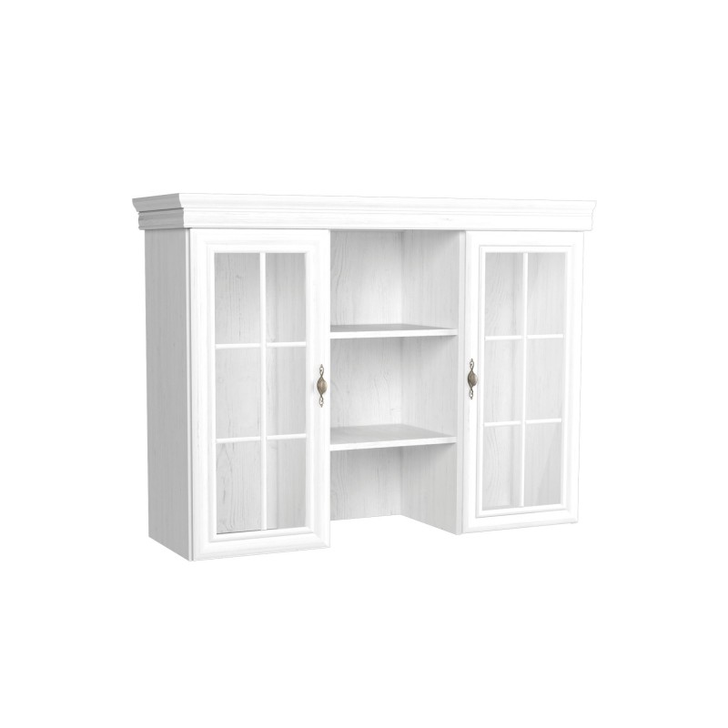 Nadstawka wyposażona jest w dwie przeszklone szafki z półkami oraz dwie otwarte półki między nimi, oferując dodatkową przestrzeń do eksponowania dekoracji lub przechowywania. Metalowe uchwyty w kolorze złota dodają jej elegancji i podkreślają klasyczny charakter.