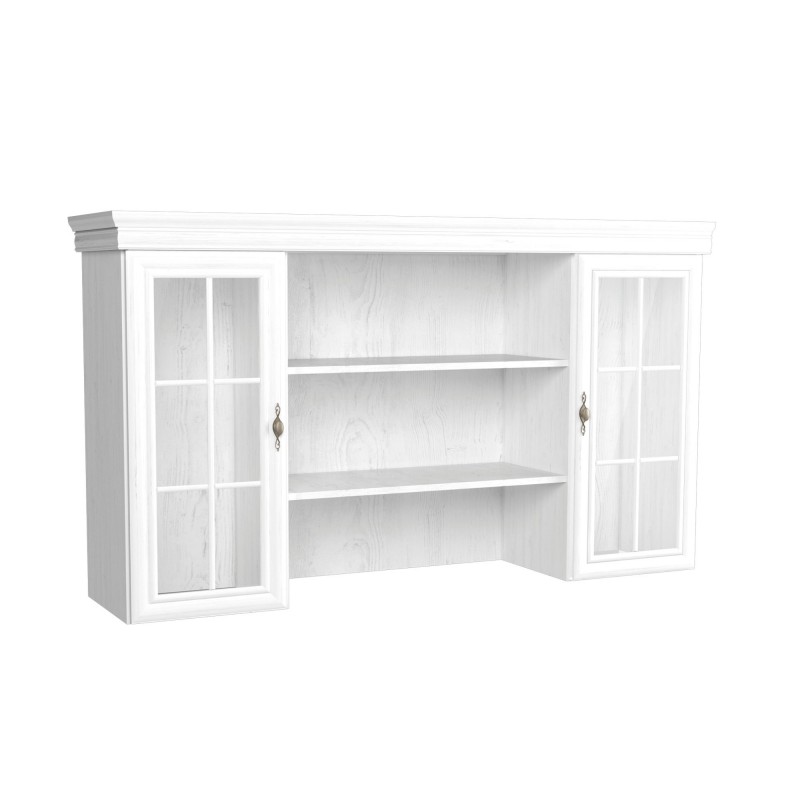 Nadstawka wyposażona jest w dwie przeszklone witryny z sześcioma półkami, oferując przestronne miejsce do przechowywania i eksponowania przedmiotów. Metalowe uchwyty w kolorze złota oraz stylizowane nóżki dodają jej elegancji i podkreślają klasyczny charakter mebla.
