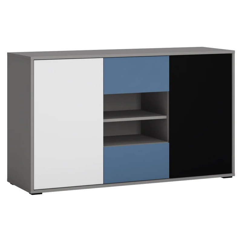 Komoda młodzieżowa LASER to nowoczesny mebel, który doskonale łączy funkcjonalność z atrakcyjnym designem. Zaprojektowana z myślą o pokoju młodzieżowym, wyróżnia się ciekawym zestawieniem kolorystycznym. Korpus w eleganckim odcieniu Szary Platynowy tworzy spokojną bazę aranżacyjną, natomiast fronty w kolorach Zgaszony Błękit, biały oraz czarny nadają meblowi dynamiczny, młodzieżowy charakter. Dzięki takiej kompozycji komoda staje się stylowym elementem wyposażenia, który ożywia wnętrze i świetnie komponuje się z innymi meblami z kolekcji LASER.
