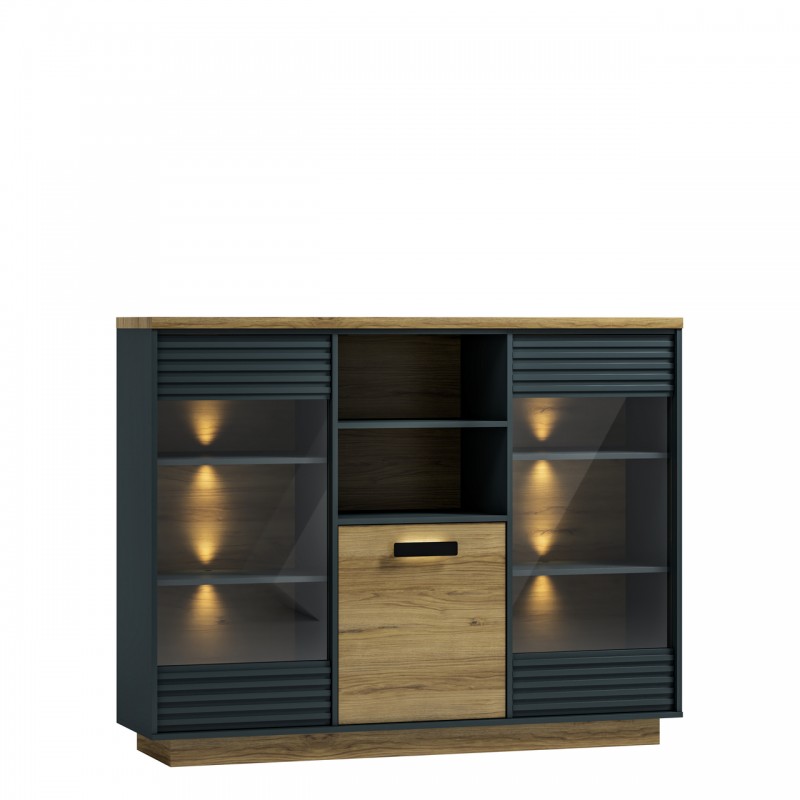 Witryny z tej kolekcji zostały wyposażone w oświetlenie LED, które podkreśla elegancję mebli oraz dodaje przytulnego, stonowanego światła do wnętrza. Dodatkowo, uchwyty z oświetleniem LED nie tylko ułatwiają otwieranie szuflad, ale również dodają subtelny akcent oświetleniowy do pomieszczenia.