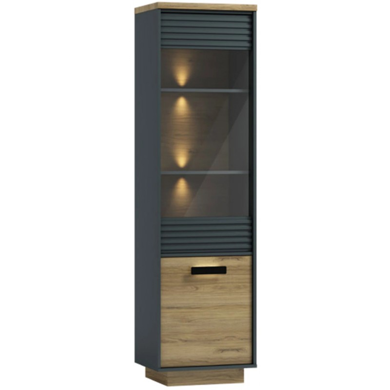 Dostępne w dwóch eleganckich wariantach kolorystycznych - dąb pradawny z antracytem lub dąb pradawny z bielą - witryna doskonale wpisuje się w różnorodne aranżacje wnętrz. Wykończenie w kolorze dąb pradawny dodaje naturalnego uroku, podczas gdy antracyt lub biel nadają meblowi nowoczesnego charakteru.