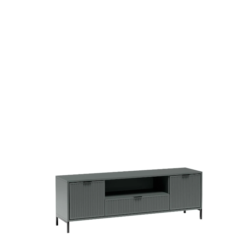 Tył szafki wykonany jest z płyty HDF, co dodatkowo wzmacnia jej konstrukcję. Metalowe nóżki o wysokości 12cm dodają lekkości całej kompozycji, jednocześnie zapewniając stabilne podparcie. System cichego domyku sprawia, że otwieranie i zamykanie szuflad i drzwi odbywa się płynnie i bez hałasu, co jest szczególnie praktyczne w codziennym użytkowaniu.