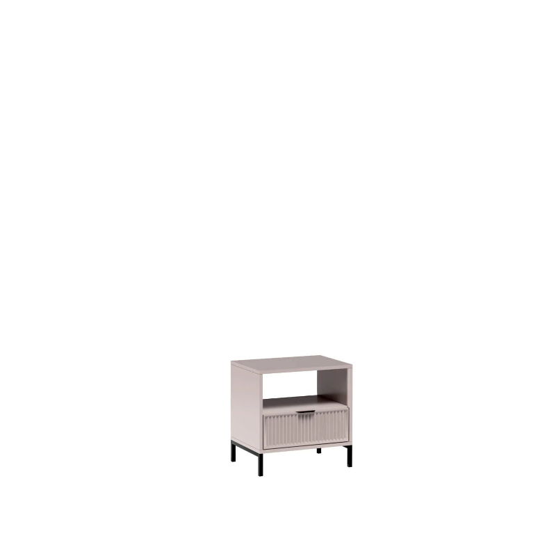 Metalowe nóżki o wysokości 12cm dodają lekkości całej kompozycji, jednocześnie zapewniając stabilne podparcie. System cichego domyku sprawia, że otwieranie i zamykanie szuflad i drzwi odbywa się płynnie i bez hałasu, co jest szczególnie praktyczne w codziennym użytkowaniu.