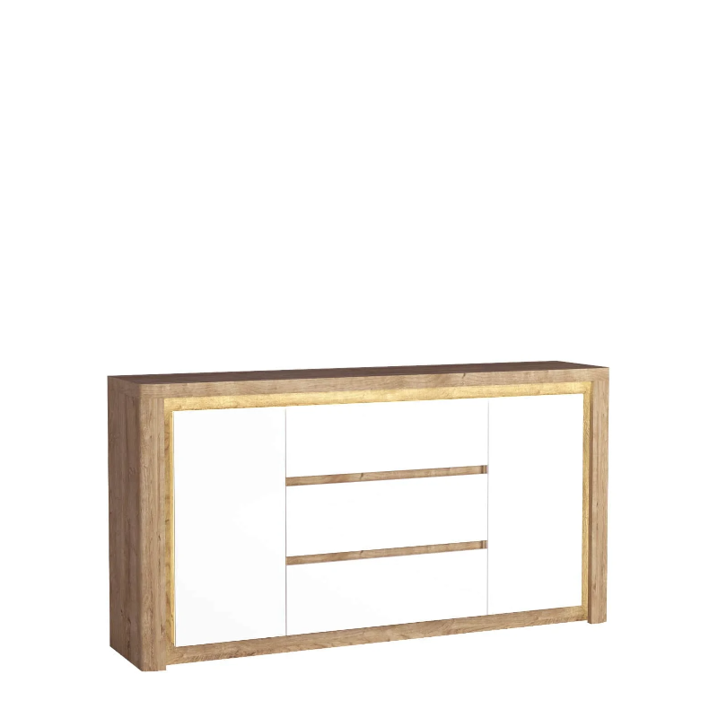 Obrzeże komody zostało wykończone okleiną ABS, zapewniającą dodatkową ochronę oraz estetyczny wygląd. Tył komody wykonany jest z płyty HDF, co dodatkowo wzmacnia jego konstrukcję. Dodatkowym atutem tej komody jest oświetlenie LED w postaci listwy o natężeniu światła 2050 lm i temperaturze barwowej 4200K, co dodaje wnętrzu subtelności i nowoczesnego charakteru.