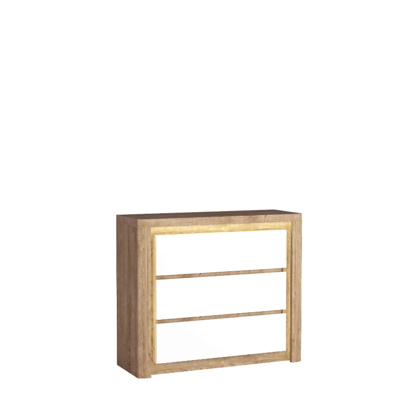 Obrzeże komody zostało wykończone okleiną ABS, zapewniającą dodatkową ochronę oraz estetyczny wygląd. Tył komody wykonany jest z płyty HDF, co dodatkowo wzmacnia jego konstrukcję. Dodatkowym atutem tej komody jest oświetlenie LED w postaci listwy o natężeniu światła 2050 lm i temperaturze barwowej 4200K, co dodaje wnętrzu subtelności i nowoczesnego charakteru.