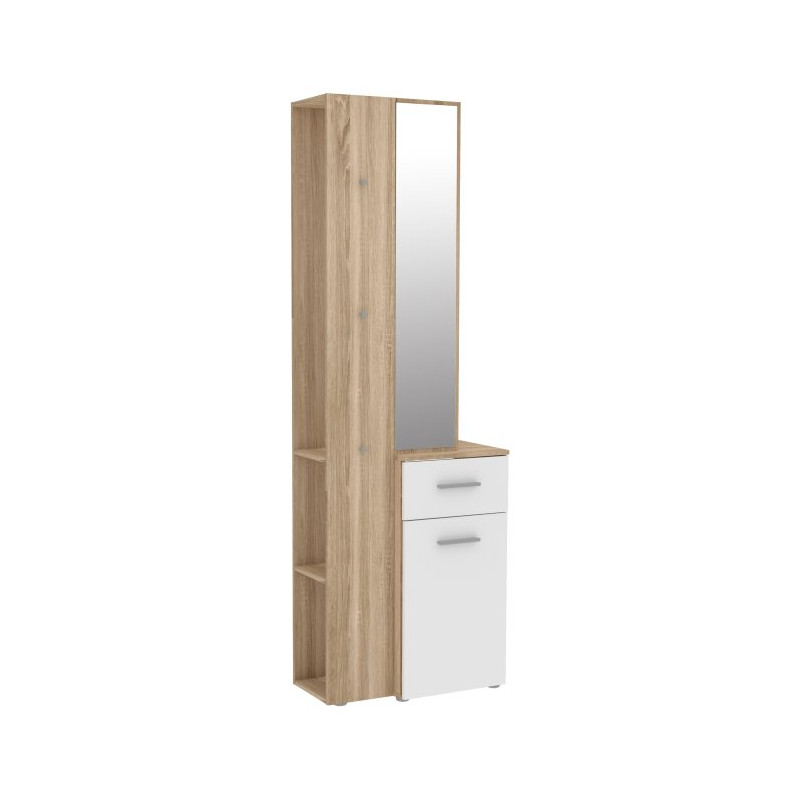 Lustro optycznie powiększa przestrzeń i umożliwia szybkie sprawdzenie wyglądu przed wyjściem, natomiast szafka oferuje miejsce na przechowywanie obuwia lub akcesoriów. Solidna konstrukcja zapewnia trwałość, a przemyślany design sprawia, że mebel doskonale wpisuje się w różne aranżacje przedpokoju.