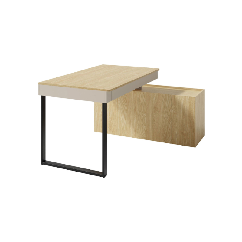 Biurko ma nietypowy kształt, który umożliwia dostosowanie go do indywidualnych potrzeb. W zestawie znajduje się funkcjonalna komoda, którą można ustawić według własnych preferencji, tworząc dodatkową przestrzeń do przechowywania lub do pracy. Dzięki temu rozwiązaniu, mebel staje się jeszcze bardziej praktyczny i wszechstronny.