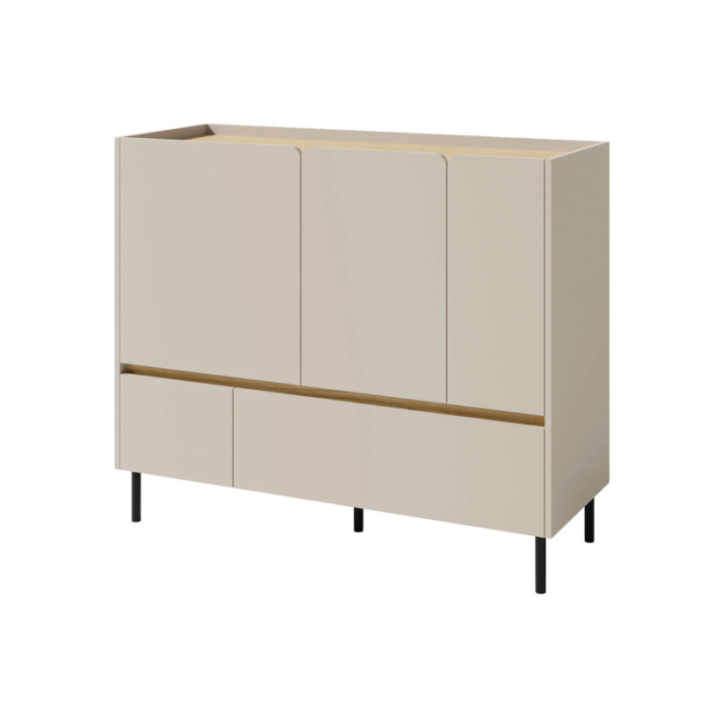 Komoda posiada trzy pojemne, zamykane schowki oraz dwie szuflady, które oferują dużo miejsca do przechowywania ubrań, dokumentów czy innych przedmiotów. Dzięki systemowi bezuchwytowego otwierania mebel jest wygodny w użytkowaniu, a jego minimalistyczna forma wpisuje się w nowoczesne trendy wnętrzarskie.