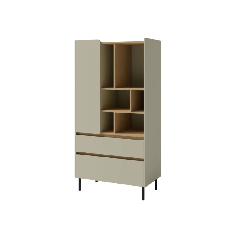Regał wyposażony jest w otwarte, jak i zamknięte wnęki oraz dwie szuflady, które idealnie nadają się do przechowywania książek, dekoracji, akcesoriów czy innych przedmiotów, zapewniając łatwy dostęp i umożliwiając wyeksponowanie najważniejszych rzeczy. Jego minimalistyczna konstrukcja bez uchwytów wpisuje się w nowoczesne trendy, a przy tym jest praktyczna i wygodna w użytkowaniu.