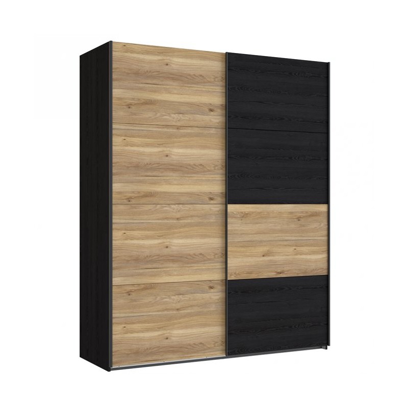Wykonana z trwałej płyty meblowej w kontrastowym połączeniu dekorów Dąb Mauvella oraz Dąb Cabezone, szafa prezentuje się stylowo i nowocześnie. Jej minimalistyczny design doskonale komponuje się z różnymi aranżacjami wnętrz, dodając pomieszczeniu charakteru i elegancji.