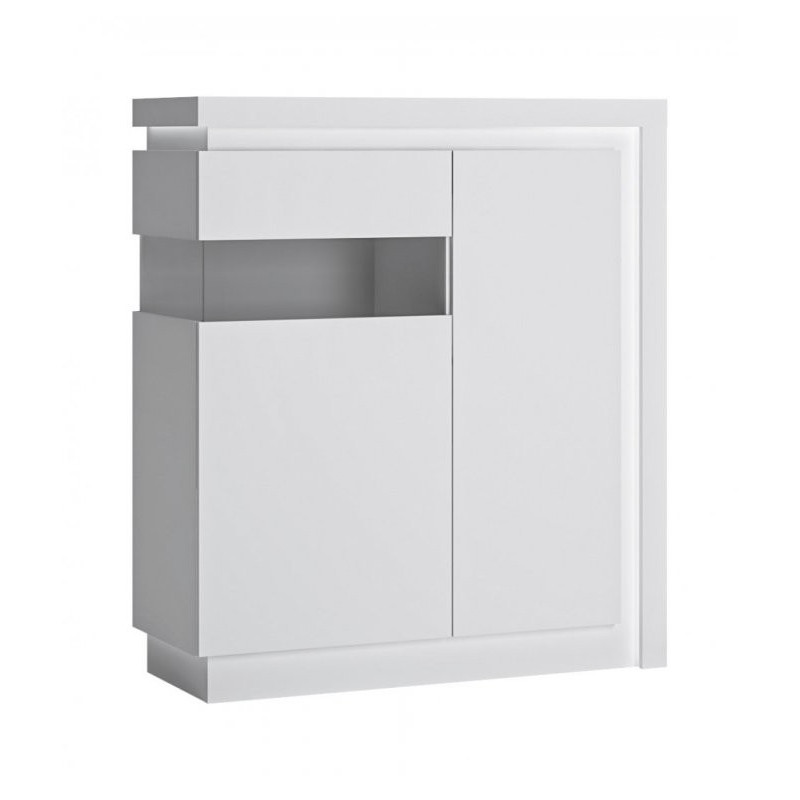 Niska, szeroka witryna z asymetrycznym podświetleniem boku oraz wieńca górnego nada Twojemu wnętrzu niepowtarzalnego uroku.