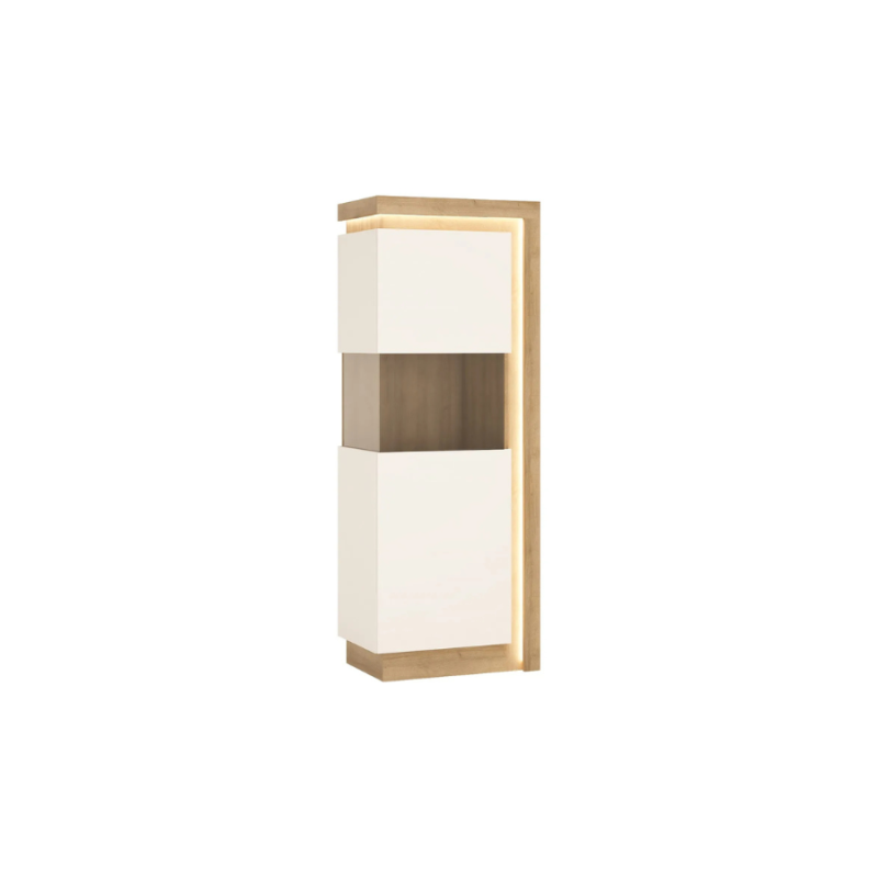 Częściowo przeszklona witryna z asymetrycznym podświetleniem boku oraz wieńca górnego nada Twojemu wnętrzu niepowtarzalnego uroku. Ciepły odcień światła idealnie podkreśla naturalny dekor dębu Riviera i stanowi źródło nastrojowego światła w pomieszczeniu. Jest to jeden z elementów kolekcji Lyon.