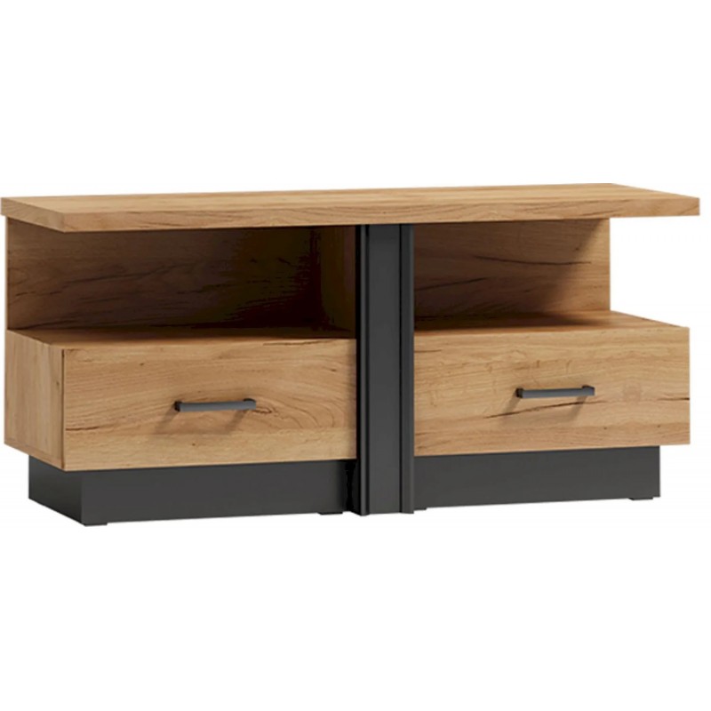 Ta elegancka szafka RTV została zaprojektowana z myślą o przechowywaniu różnych urządzeń multimedialnych oraz dodatkowych akcesoriów. Wyposażona w półkę i dwie szuflady, zapewnia odpowiednią przestrzeń na ich umieszczenie, utrzymując jednocześnie porządek w pomieszczeniu.