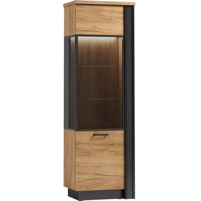 Ta jednodrzwiowa witryna wyróżnia się swoim wyjątkowym designem, który charakteryzuje się harmonijnym połączeniem dwóch kolorów. Zestawienie kolorystyczne, dąb craft i czarny, nadaje wnętrzu charakteru i elegancji, doskonale wpasowując się w różnorodne aranżacje wnętrz.