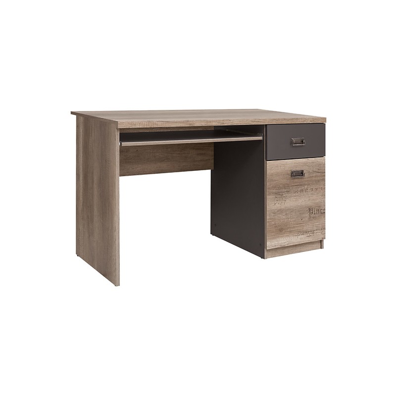 - Biurko w stonowanym wybarwieniu dąb canyon monument przełamano akcentem w kolorze szary wolfram.