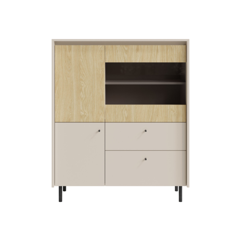 Czarne, wysokie, metalowe nóżki oraz minimalistyczne uchwyty podkreślają nowoczesny styl komody. Kolorystyka łączy piskową beżową barwę z frontami w odcieniu dębu olejowanego, nadając wnętrzu ciepły i przytulny charakter. Produkt dostarczany jest w formie do samodzielnego montażu, z dołączoną instrukcją oraz niezbędnymi akcesoriami montażowymi.
